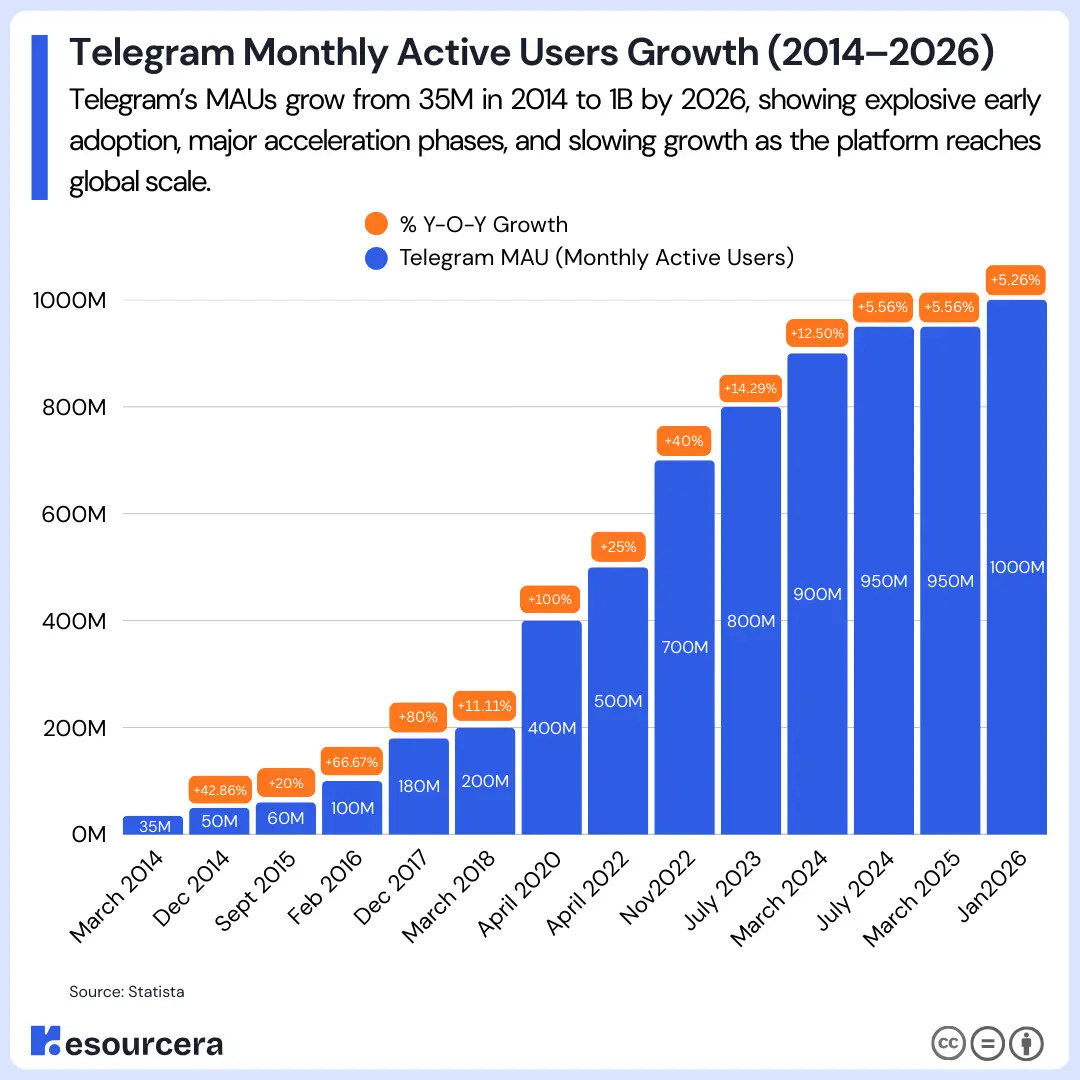 More Information →Telegram MAU growth trend reaching 1 billion users by 2026